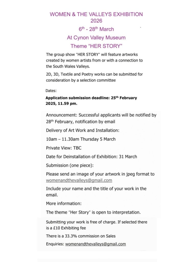 The Women & The Valleys art exhibition is now in its 5th year at Cynon Valley Museum and submissions are invited from women who either live in the South Wales Valleys or have a connection to them.