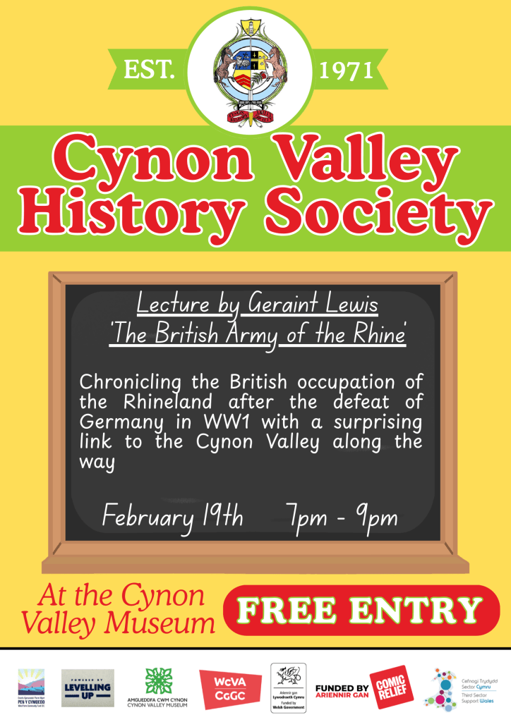 Cynon Valley History Society are hosting a lecture next Thursday, on the ‘British Army of the Rhine in WW1’.
